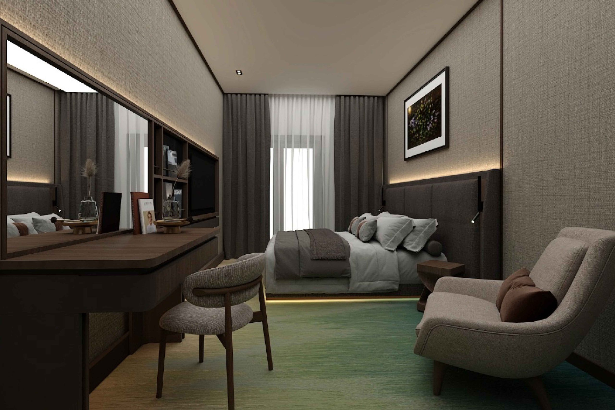 Kao polazišnu točku, zajedno s investitorom i dizajnerima studia Entract odabrali smo nijanse šumske zelene boje, te toplih bež tonova kako bi napravili skladnu kombinaciju boja i postigli toplinu i mir prirode u prostoru.