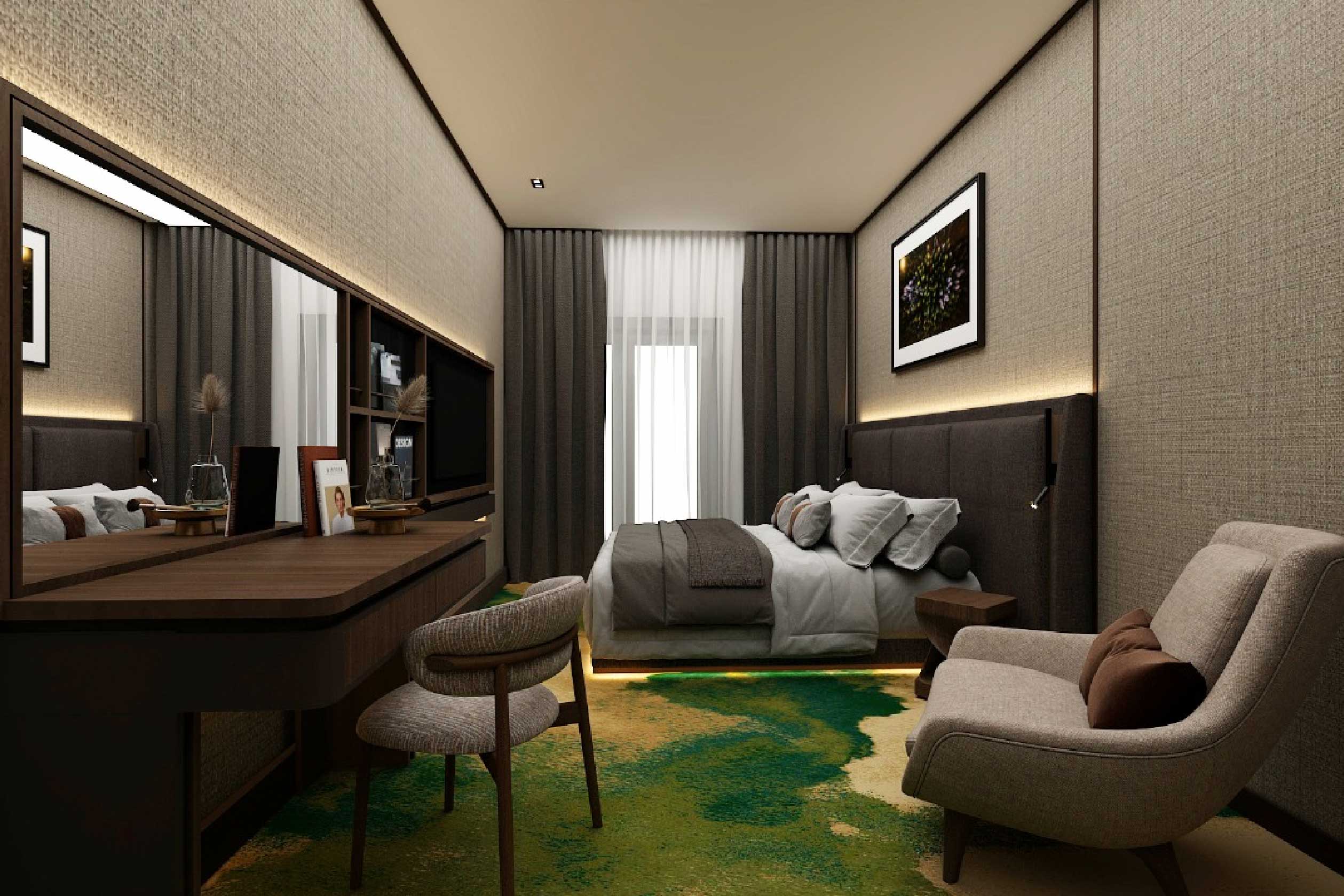 Finalni odabir i dizajn prostora je ipak uključio jedan drugačiji pristup gdje se od smirenijih bež tonova u javnom prostoru polako uvodila umirujuća šumska zelena koja je u sobama naglašena u malo dramatičnijem obliku i simbolizira uzburkane vode rijeke Morače: